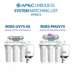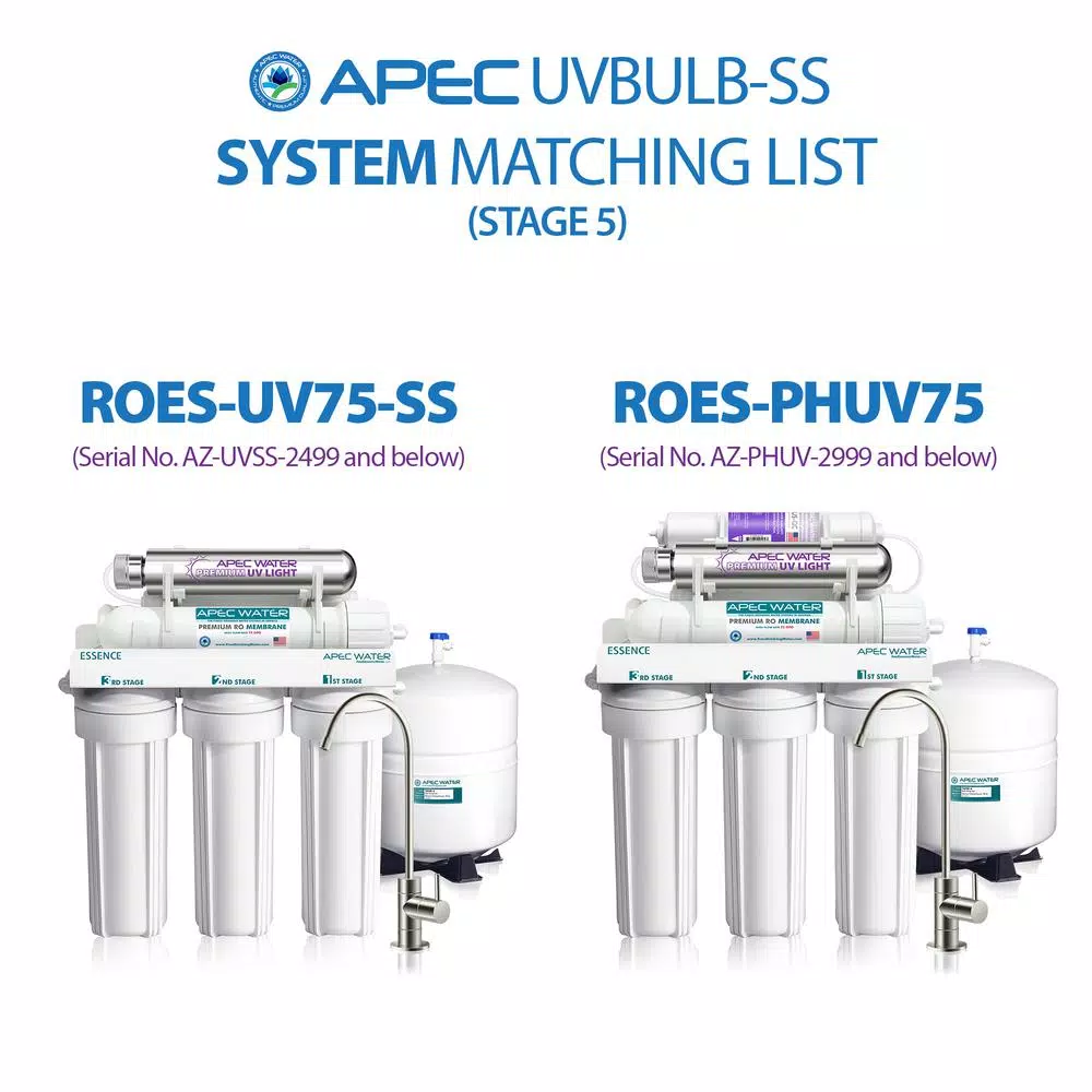 - Replacement UV bulb ONLY for APEC ROES-UV75-SS with serial number AZ-UVSS-2499 and below or APEC ROES-PHUV75 with serial number AZ-PHUV-2999 and below