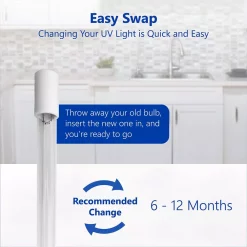 Start drinking healthy and stop drinking contaminants with your own home Ultraviolet UV system. The UV light is good for 6 months to 1 year of use and features a monitoring system to alert you when the power of the UV bulb falls below range. A red light on the ballast will activate once the bulb needs to be replaced and will sound a beep. The life is based on average water quality. Your UV light purifier life may be different depending on your water quality, temperature, and incoming pressure. This durable Ultraviolet bulb can deliver up to 1 gallon per minute. The system works with 45-80 psi and water temperatures between 40-100Β°F. Made with 100% pure food-grade materials complete with high intensity UV water sterilizer bulb and reflective inner walls for maximum UV coverage. Never turn on your ultraviolet light outside of its housing. Do not look directly at or expose any part of your body to the UV water filter light. Choose the UV system and UV water purifier that lasts longer to give you the best value: The Express Water Ultraviolet Housing and Bulb FLTUV110BCH.