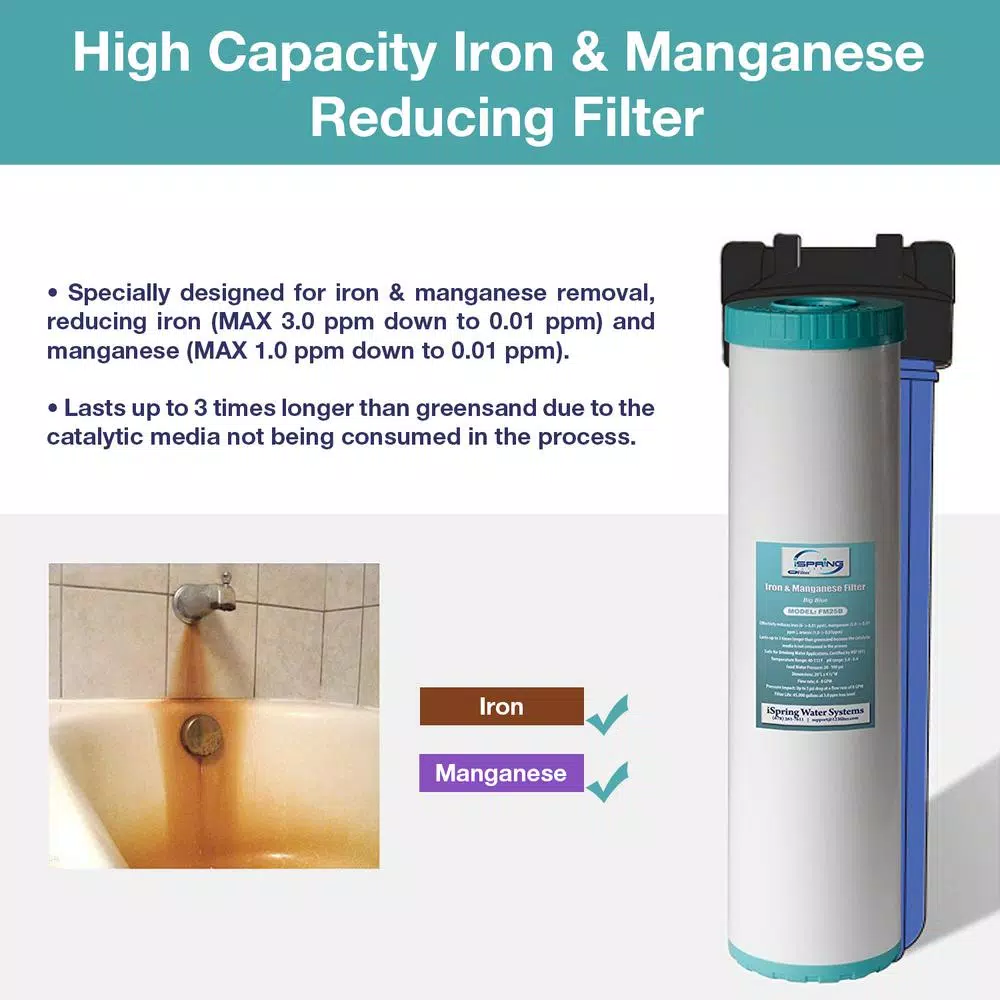 - Powerful Iron & Manganese Reducing: iSpring FM25B is specially designed for iron & manganese removal, reducing iron (MAX 3.0 ppm down to 0.01 ppm) and manganese (MAX 1.0 ppm down to 0.01 ppm). We recommend to get your water tested before purchase.
