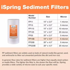 iSpring sediment filters are manufactured to comply strictly with FDA standard (CFR – Part 177) and tested by independent third party against NSF/ANSI standard for material safety and water quality. (NSF/ANSI 42, by NSF International, 10/2018)A combination of a sparse layer, compaction layer, and precision layer ensures this iSpring premium 5-micron polypropylene sediment filter captures dirt, sand, silt, dust, rust, and scale particles effectively. Combining with other filters such as CTO filter(FC15B), iSpring fine PP sediment filter FP15B not only brings clean and refreshing water to every faucet in your home but also helps to prolong the lives of your appliances and protects plumbing from sediment and scale buildup. With affordable pricing, solid quality, prompt delivery, and top notch customer service, we hope to assist in bringing you great water for years to come.