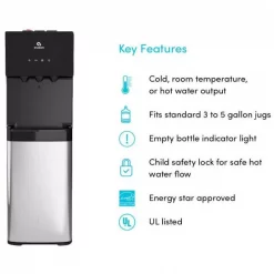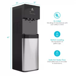 - Bottom loading: our water cooler is bottom loading to eliminate the strain of lifting, reduce spills and is suitable for 3-5 Gal. water bottles (bottle not included)