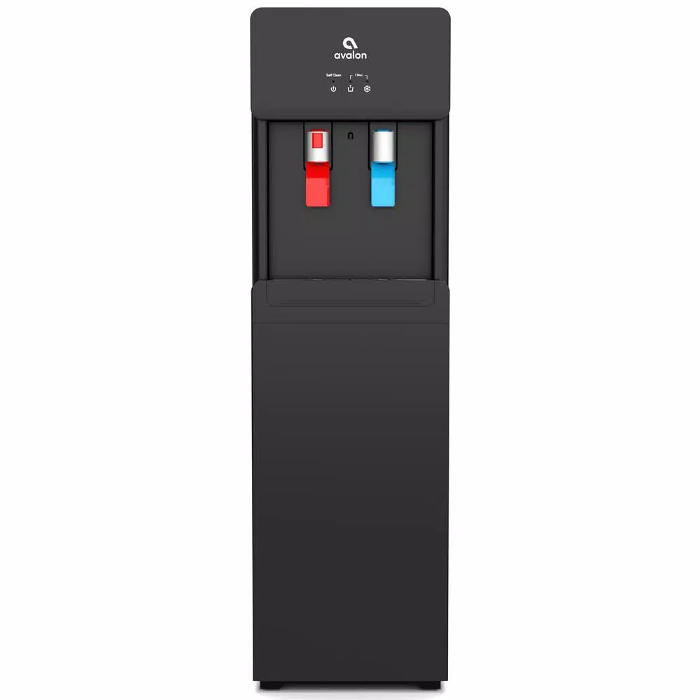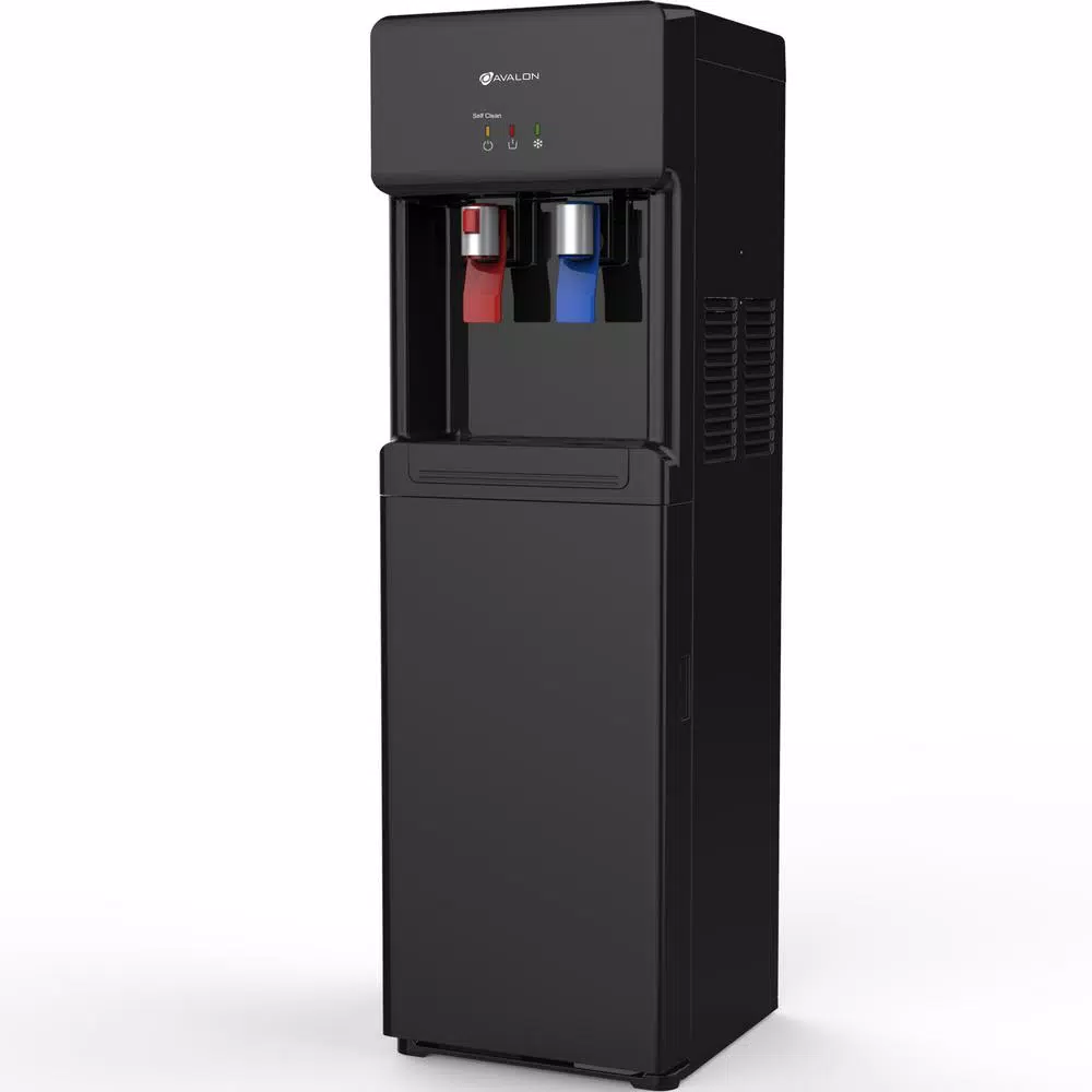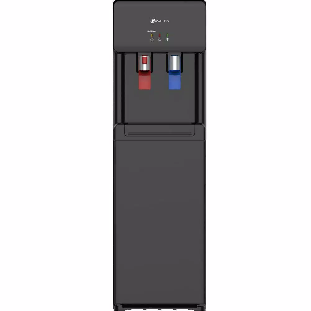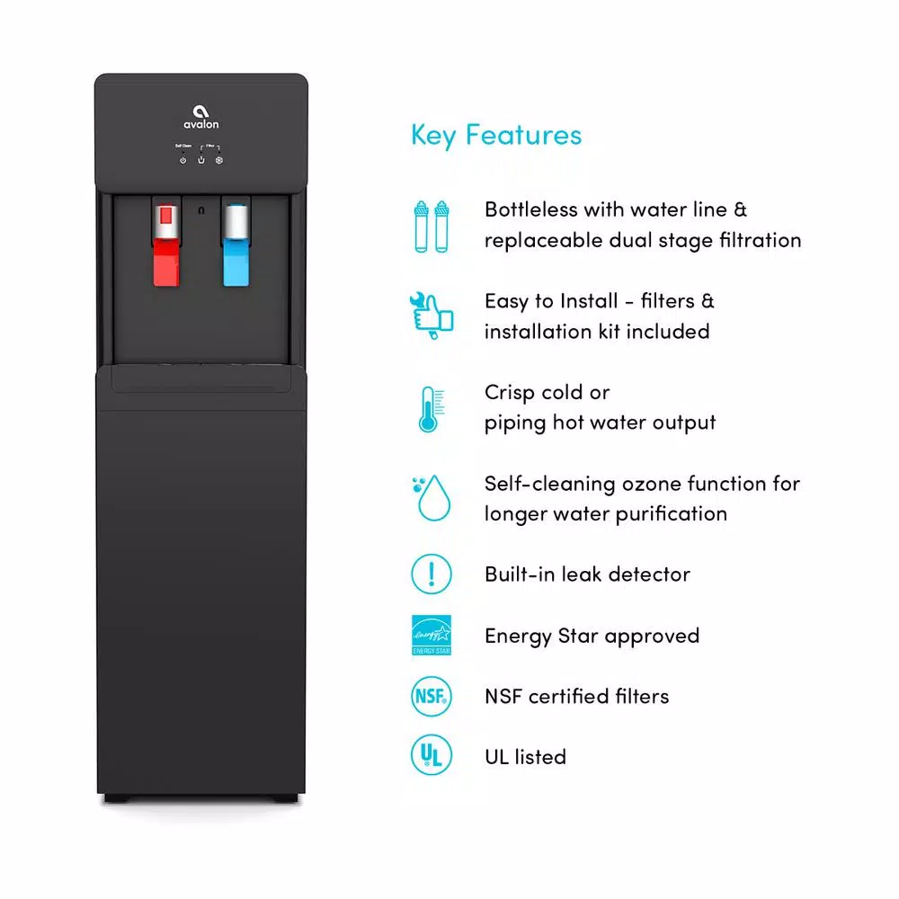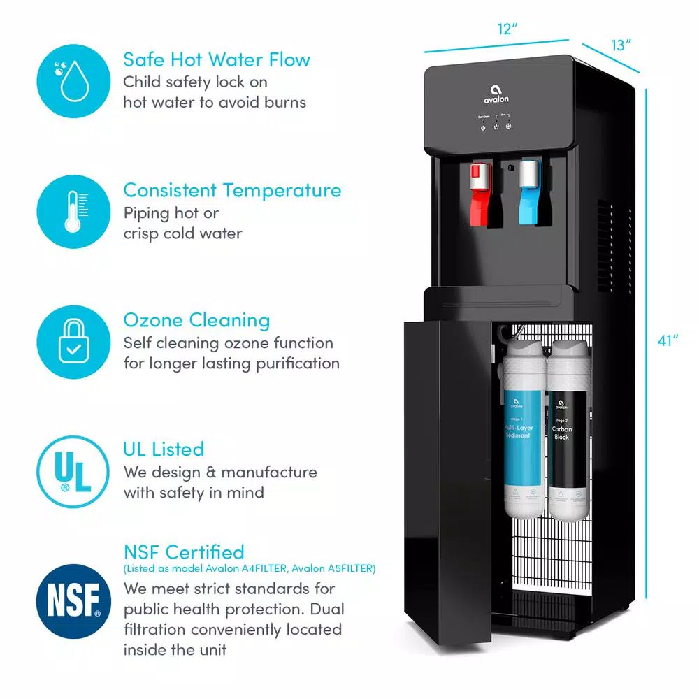 The Avalon Self Cleaning Bottleless Hot/Cold Water Cooler is made with innovation and style. The easy-to-use paddle spouts make it so much more convenient to use. The machines highly efficient compressor makes the cold water crisp and ice cold at approximately 47° F. The hot faucet is approximately 185° F. Due to the extremely hot water, we’ve added a child safety lock on the hot water faucet. This water cooler is bottle-less with an NSF certified activated carbon filter and a sediment filter in the cabinet and a water line that can be attached to your water source. The water is taken from your water source and filtered through the filters and then through the machines hot and cold water tanks. The tanks hold 1 liter of hot water and 3.6 liters of cold water. There is also a built-in leak detector to automatically monitor the water flow from the water source into the machine. We have incorporated a self-clean ozone function which will automatically clean the machine’s water tank with the injection of ozone by the press of a switch. The water cooler is UL listed and complies with all standards of Energy Star. All parts necessary for installation are included. The dispensing area is 10×2.5×9.5 inches with 7.5 inches of space below the spouts. There is a removable drip tray at the bottom of the dispensing area to catch any drips or spills. The unit dimensions are 13x12x41 inches.