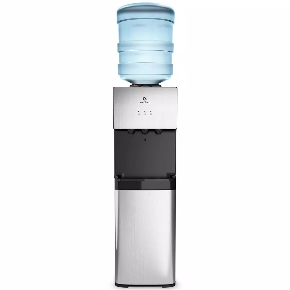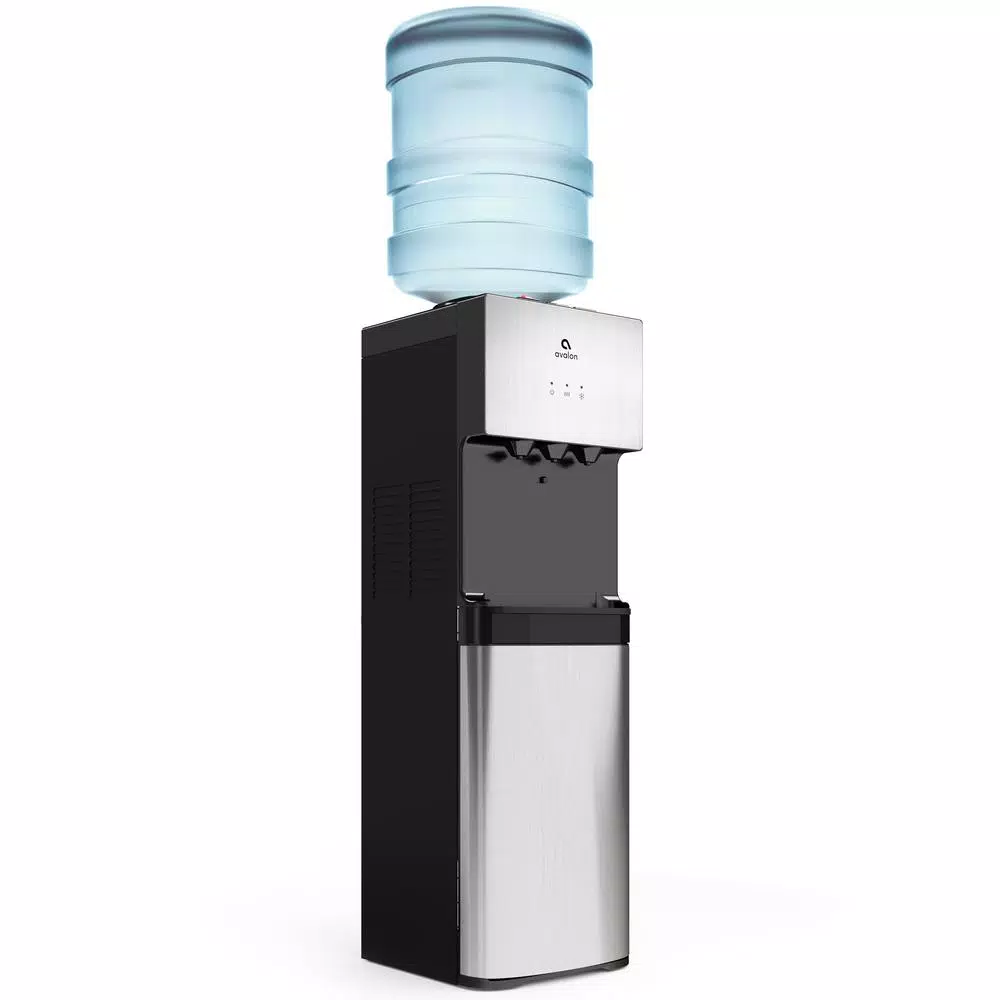 Avalon 3 Temperature Top Loading Water Cooler with Child Safety Lock is made with an innovative stainless steel body. It offers a choice of 3 water temperatures. The easy-to-use push button spouts make it so much more convenient to use. Simply press the temperature button of choice and allow the water to flow from the given spout. The machines highly efficient compressor makes the cold water crisp and ice cold at approximately 47F without the need of adding ice cubes to your drink. The hot faucet is hot enough to cook oneโs tea or coffee or any other steaming hot beverage at approximately 180F. Due to the extremely hot water, weโve added a child safety lock on the hot water faucet. The dispensing area is 12x3x10 in. with 9 in. of space below the spouts. The water cooler is UL listed and complies with all standards of ENERGY STAR. The unit dimensions are 12 in. x 13 in. x 41 in.