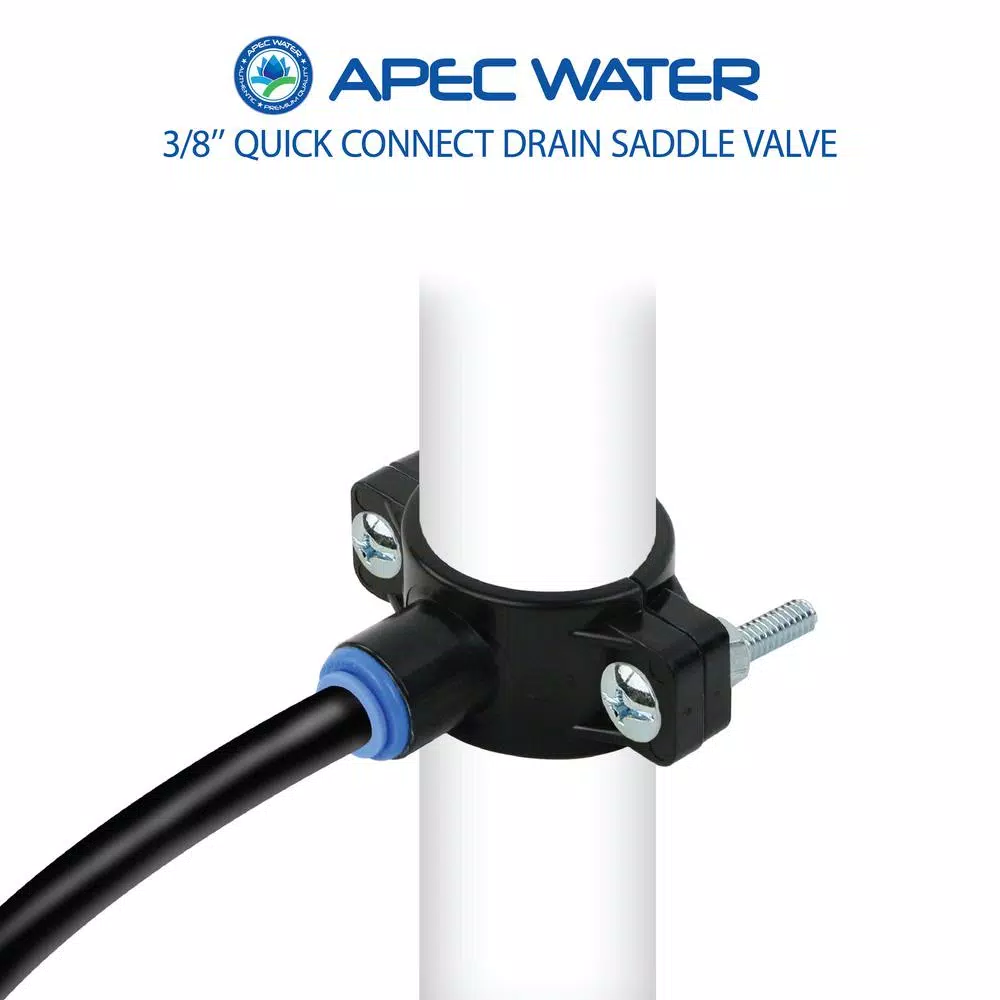 This 3/8 in. Quick Connect Drain Saddle is used to connect drain tube of RO system to the sink drain pipe. The clamp fits 1-1/4 in. to 1-1/2 in. Dia drain pipes. It is compatible with all under counter RO systems using 3/8 in. tubing.
