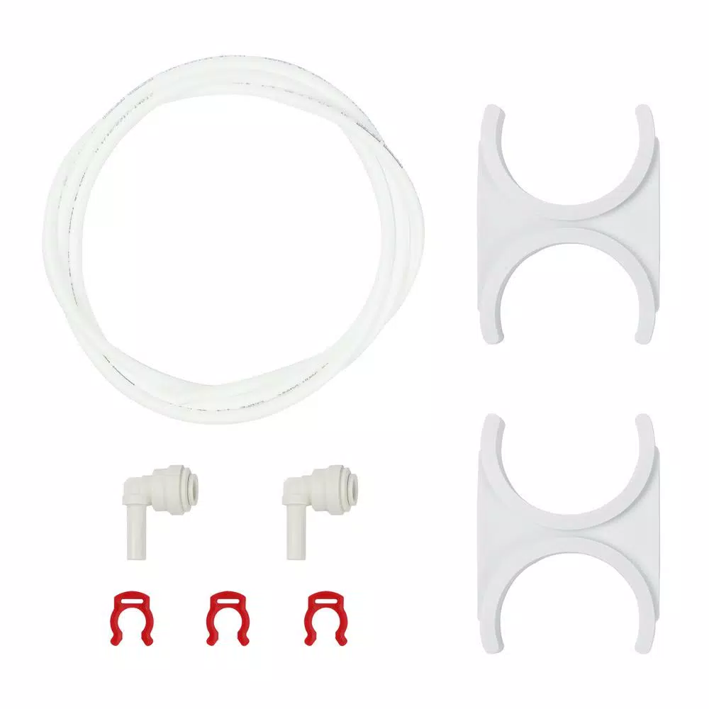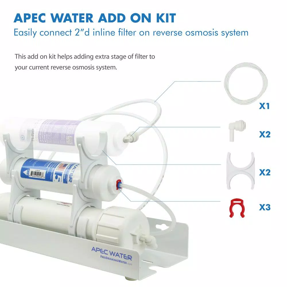 APEC Water Add On Kit allows you to easily connect all industry standard 2 in. D inline filters onto your RO system. Simply use the clips to mount the additional filter onto the system by clipping onto another 2 in. filter on top of your system. Tubing, two elbow fittings and three locking clips are included to help with the installation. This kit helps mount your inline filter securely to your water purification system to save space, while looking nice and neat.
