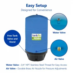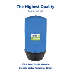 Heavy Duty Construction -All Materials in the expansion tank are 100% food safe and FDA grade to make sure your water is tasteless, odorless, and contaminant free -The inside of the RO water tank is completely smooth to prevent damage to the bladder -The water storage tank is coated with a two-part epoxy primer and finished with polyurethane to resist damage even in the outdoors -The adjustable bladder within the water tank is made of high grade Chlorobutyl rubber and is completely airtight -The inside liner of the water filter tank is made of Virgin Polypropylene, the most durable liner even on a molecular level All the Water You Need A 20-gallon water pressure tank can hold 14 gallons of water. All tanks have a certain amount of their capacity used by the air bladder, which is necessary for drawing water from the water reservoir tank. Be Confident All components are high quality food-grade -Each RO tank passes extensive durability testing -A sealed brass air nozzle and o-ring sealed air valve caps means consistent air pressure -This reverse osmosis tank is designed to last over five years