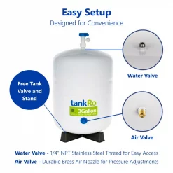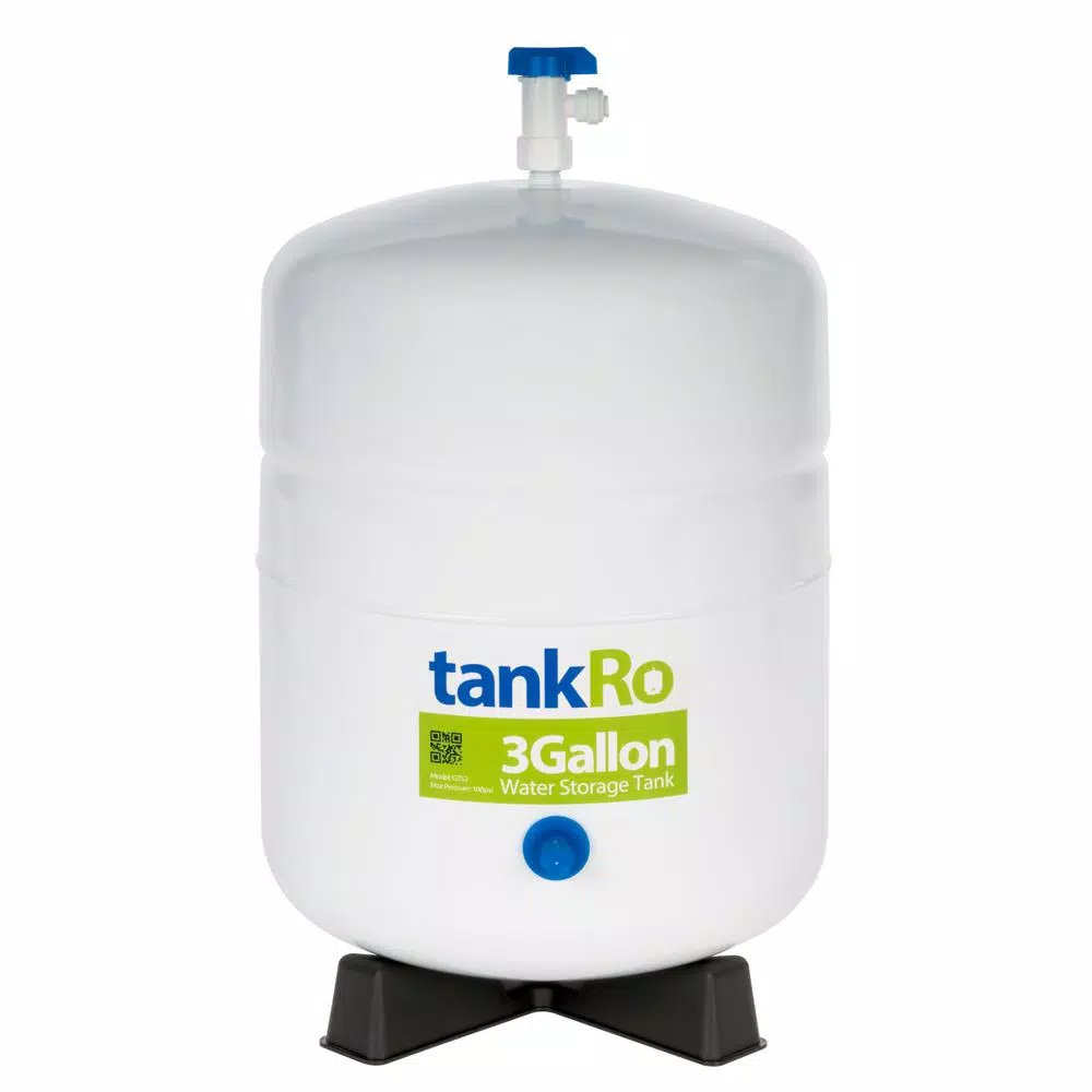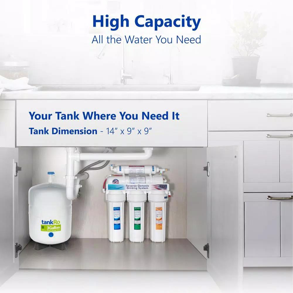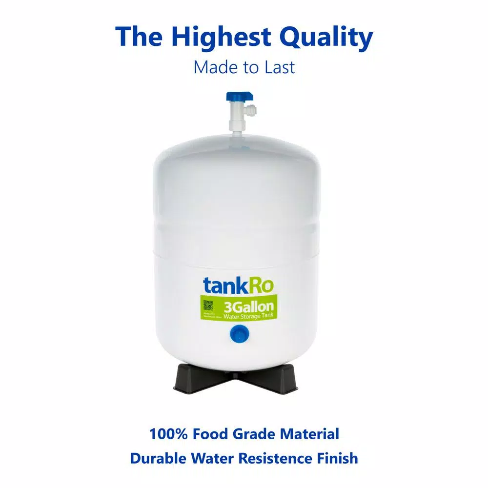 Heavy Duty Construction -All Materials in the expansion tank are 100% food safe and FDA grade to make sure your water is tasteless, odorless, and contaminant free -The inside of the RO water tank is completely smooth to prevent damage to the bladder -The water storage tank is coated with a two-part epoxy primer and finished with polyurethane to resist damage even in the outdoors -The adjustable bladder within the water tank is made of high grade Chlorobutyl rubber and is completely airtight -The inside liner of the water filter tank is made of Virgin Polypropylene, the most durable liner even on a molecular level All the Water You Need A 3-gallon water pressure tank can hold 2.2 gallons of water. All tanks have a certain amount of their capacity used by the air bladder, which is necessary for drawing water from the water reservoir tank. Be Confident All components are high quality food-grade -Each RO tank passes extensive durability testing -A sealed brass air nozzle and o-ring sealed air valve caps means consistent air pressure -This reverse osmosis tank is designed to last over five years
