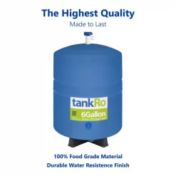 Heavy Duty Construction -All Materials in the expansion tank are 100% food safe and FDA grade to make sure your water is tasteless, odorless, and contaminant free -The inside of the RO water tank is completely smooth to prevent damage to the bladder -The water storage tank is coated with a two-part epoxy primer and finished with polyurethane to resist damage even in the outdoors -The adjustable bladder within the water tank is made of high grade Chlorobutyl rubber and is completely airtight -The inside liner of the water filter tank is made of Virgin Polypropylene, the most durable liner even on a molecular level All the Water You Need A 6-gallon water pressure tank can hold 4.4 gallons of water. All tanks have a certain amount of their capacity used by the air bladder, which is necessary for drawing water from the water reservoir tank. Be Confident All components are high quality food-grade -Each RO tank passes extensive durability testing -A sealed brass air nozzle and o-ring sealed air valve caps means consistent air pressure -This reverse osmosis tank is designed to last over five years