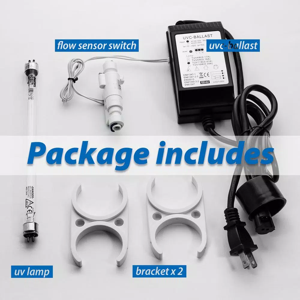 The package includes everything you need to add to your current water filter system. Stainless steel housing – 11-Watt UV lamp, Phillips Brand – Quartz sleeve – Rubber O-ring – Electronic ballast with Smart Flow Sensor Switch AC110-Volt/60 Hz – 2 Elbow fittings and nut. 2 brackets to hang the filter on the wall.