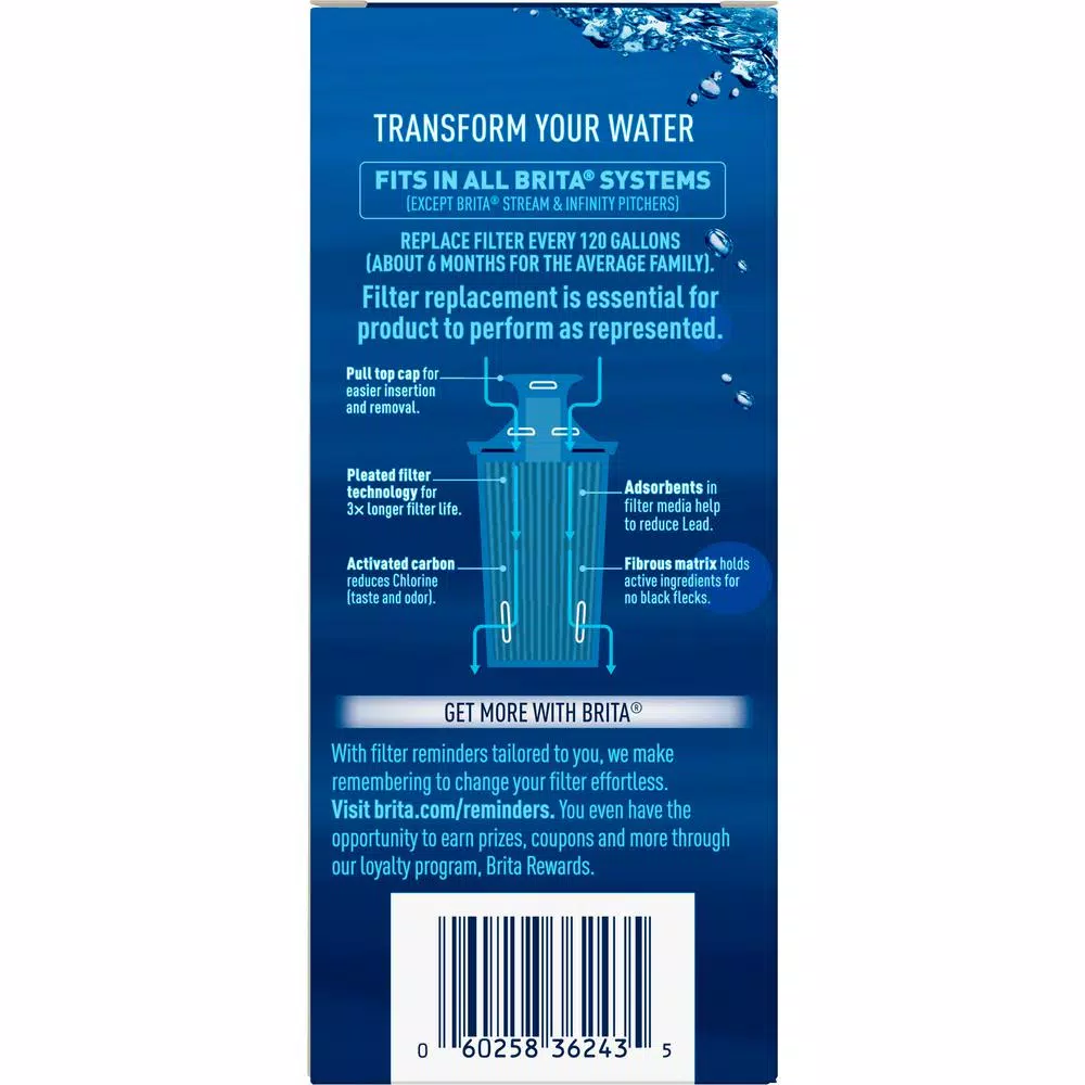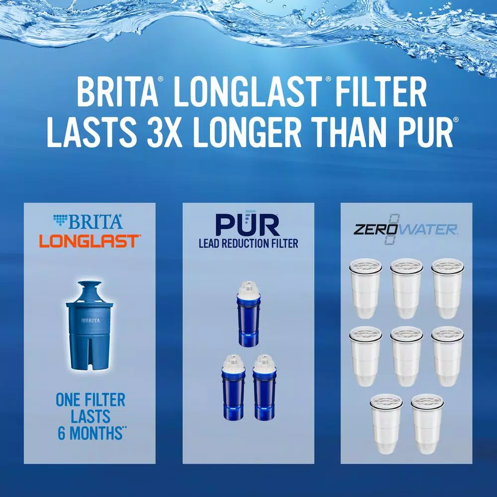 Keep tap water healthier and tasting better longer with Brita Longlast Pitcher Replacement Filters. Made with pleated filter technology for 3X longer life compared to 40 gallon filters. Longlast replacement filters reduce lead, asbestos, and cadmium impurities that can adversely affect your health over time (substances reduced may not be in all users’ water). Change the Longlast filters every 120 gallons, about every 6 months for the average family, for best performance. The pull top cap on these filters makes insertion and removal easy. With activated carbon to reduce chlorine taste and odor, these filters deliver great-tasting water and maintain a healthy level of fluoride, an additive in water (applies to fluoridated municipal tap water). The fibrous matrix in the filter holds active ingredients in place so no black flecks appear in your water. One LongLast Filter can replace 900 standard 16.9 ounce water bottles.