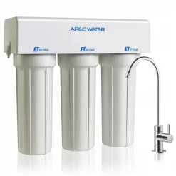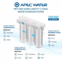 The APEC Water Systems WFS-1000 3-Stage Water Filtration System delivers clean filtered water at an affordable price. This complete 3-stage water filter system is made from high caliber components to offer long-lasting, reliable performance, while removing chemical, taste and odors. The 3 premium quality filters lasts over 12 months for fewer filter change outs and high performance. The system provides a continuous on demand supply of quality filtered water directly to the provided water dispenser.