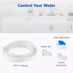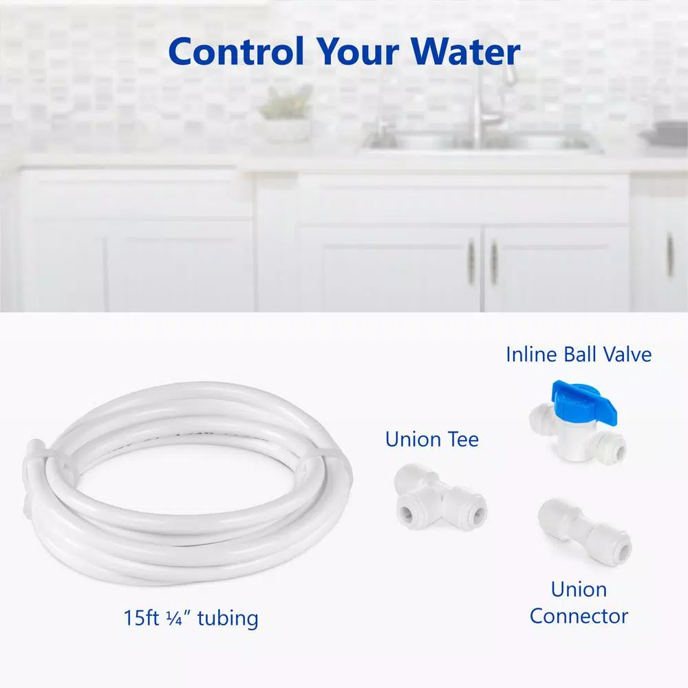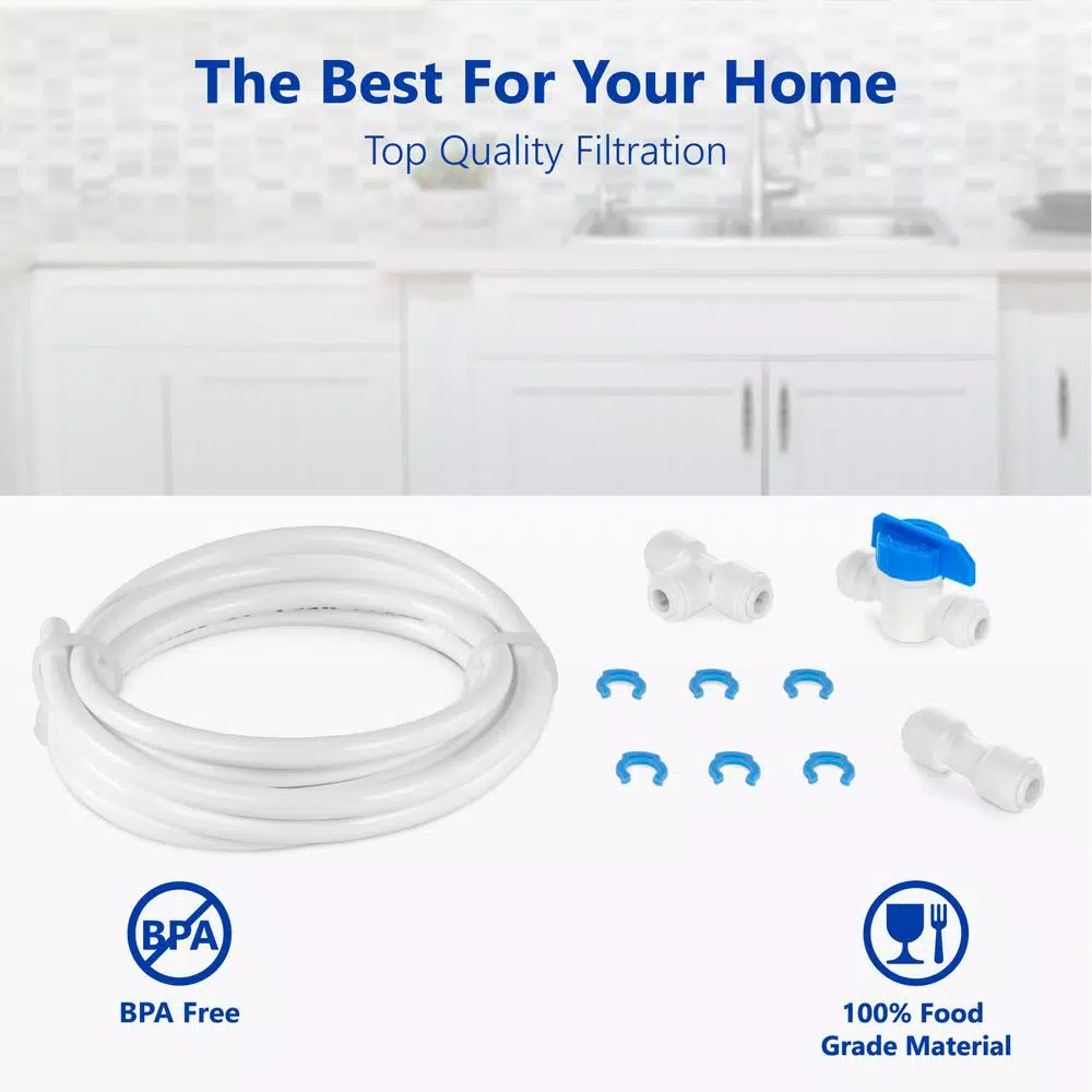 Upgrade your filtration and your home with an easy setup Refrigerator Connection Kit. This kit is compatible with all standard reverse osmosis and undersink filtration systems. The kit uses quick connect fittings and tubing to attach your drinking water filtration to your refrigerator. With a simple, durable, food grade design keeping your water tasting great and safe is simple. The entire kit is made of temperature resistant polypropylene so it doesnβt warp or affect the taste of your water. The BPA free construction ensures that your system is kept completely pure. You may need additional fittings installation if you are installing a non-standard filter or have a refrigerator with different connection needs. The package includes 1 inline ball valve, 1 union tee, 1 union connector, and 15 ft. of white tubing. Get the most out of your filtration. Choose the reliable easy to upgrade your water: The Express Water Refrigerator Connection Kit PRTREFKIT14Q is the best in water purification.