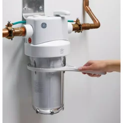 The GE Heavy-Duty Household Water Filtration System reduces sand, sediment and rust from your main water supply. It is a high-flow system with a 40 psi – 100 psi feed water-pressure tolerance. A clear sump allows easy viewing of the filter to monitor its condition and a canister wrench is included for easy filter changes. A bypass valve helps increase filter life when filtered water is not needed. This quick-connect system comes with hardware and an installation kit. It is NSF certified for safety and reliability.