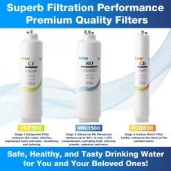 - [Superb filtration performance] with its 1st-stage 3-in-1 composite sediment and carbon block filter and 2nd-stage advanced RO Membrane(0.0001 micron), RO500 effectively removes TDS, limescale, up to 99% of over 1,000 contaminants, including lead (removes up to 98%), chlorine, fluoride, arsenic, asbestos, calcium, sodium, and more, 3rd stage carbon block filter further enhances the taste of the purified water, enjoy all the benefits of drinking clean and healthy water